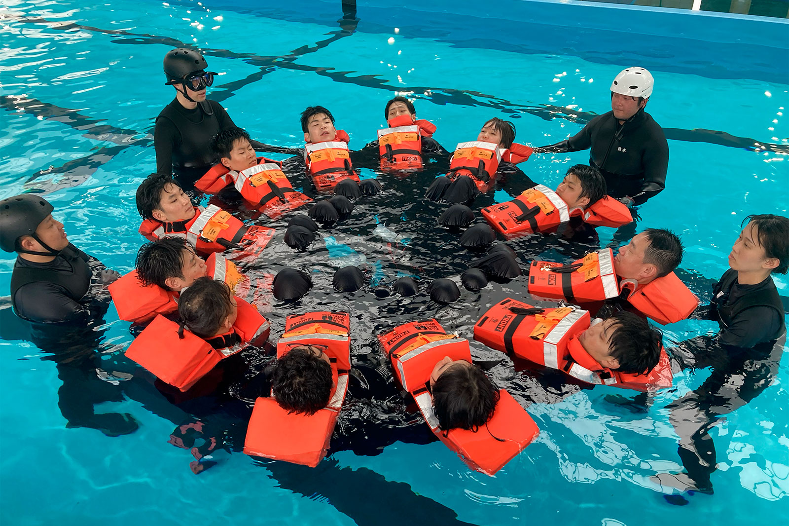STCW条約で求められる船員基本訓練で、海上で起こりうる有事への対応を想定し、火災時の消火活動から船内捜索、船を捨てて退避(退船)する際に使用する救命属具の使用方法や生存技術を訓練します。